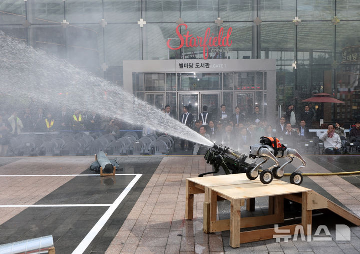 [서울=뉴시스] 배훈식 기자 = 2025 강남구 안전한국훈련 긴급구조 종합훈련이 진행된 20일 오후 서울 강남구 코엑스에서 소방대원들이 로봇개를 활용한 화재 진압과 인명구조 활동 훈련을 하고 있다. 2025.10.20. [email protected]