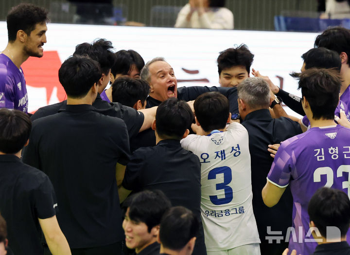 [수원=뉴시스] 배훈식 기자 = 20일 오후 경기 수원시 수원실내체육관에서 열린 2025~2026 진에어 V리그 남자부 개막전 한국전력과 우리카드의 경기, 세트 스코어 3-0으로 승리를 차지한 우리카드 파에스 감독이 선수들과 함께 기뻐하고 있다. 2025.10.20. [email protected]