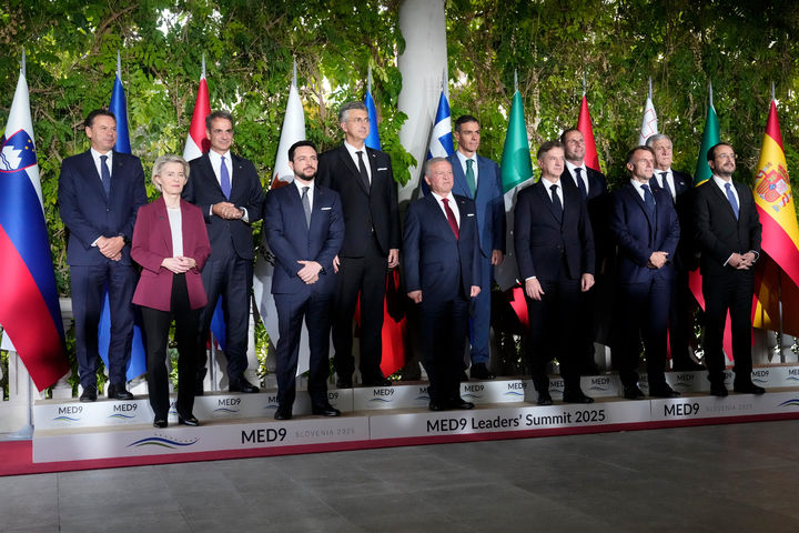 [포르토로즈=AP/뉴시스] 지중해 연안 9개 회원국(MED9) 정상들이 20일(현지 시간) 슬로베니아 포르토로즈에서 회의에 앞서 단체 사진을 찍고 있다. 이들은 회의에서 유럽연합(EU)을 향해 기후변화로 이들 나라가 맞닥뜨린 위기에 대해 더 많은 투자를 해달라고 촉구하고 나섰다. 이 자리에는 프랑스, 이탈리아, 스페인, 포르투갈, 그리스, 크로아티아, 몰타, 키프로스, 슬로베니아 정상, 그리고 우르술라 폰데어라이엔 EU 집행위원장이 함께했다. 2025.10.21.