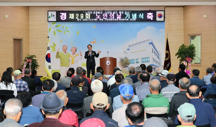 [괴산=뉴시스] 서주영 기자 = 송인헌 충북 괴산군수가 21일 대한노인회 괴산군지회에서 열린 '제 29회 노인의 날 기념식'에 참석해 발언하고 있다. (사진= 괴산군 제공) 2025.10.21. [email protected]