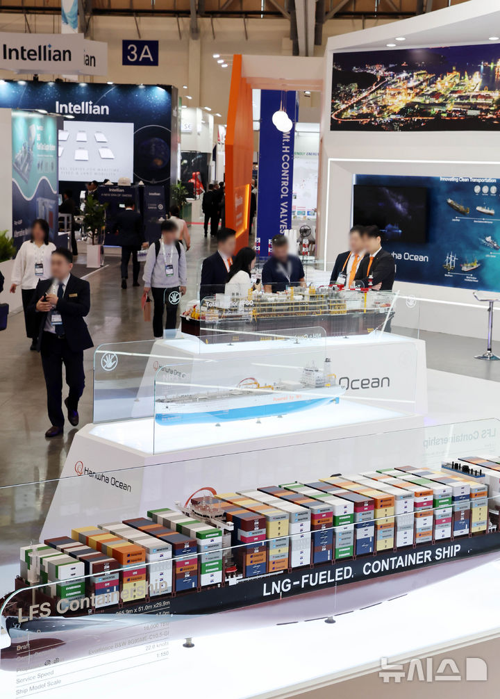[부산=뉴시스] 하경민 기자 = '2025 국제조선 및 해양산업전'이 열린 21일 부산 해운대구 벡스코 제1전시장에서 관람객들이 한화오션 부스에 전시된 다양한 선박의 모형을 둘러보고 있다.