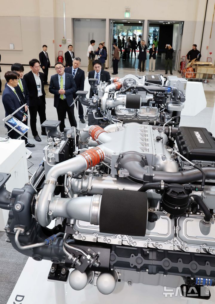 [부산=뉴시스] 하경민 기자 = '2025 국제조선 및 해양산업전'이 열린 21일 부산 해운대구 벡스코 제1전시장에서 관람객들이 HD현대인프라코어 부스에 전시된 DX15와 DX22 등 전자식 엔진을 둘러보고 있다.