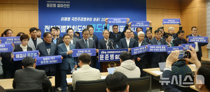 [전주=뉴시스] 김얼 기자 = 더불어민주당 윤준병(가운데) 국회의원이 21일 전북 전주시 전북특별자치도의회 기자회견장에서 더불어민주당 전북특별자치도당 도당위원장 출마 선언 기자회견을 열고 회견문을 낭독하고 있다. 2025.10.21. [email protected]