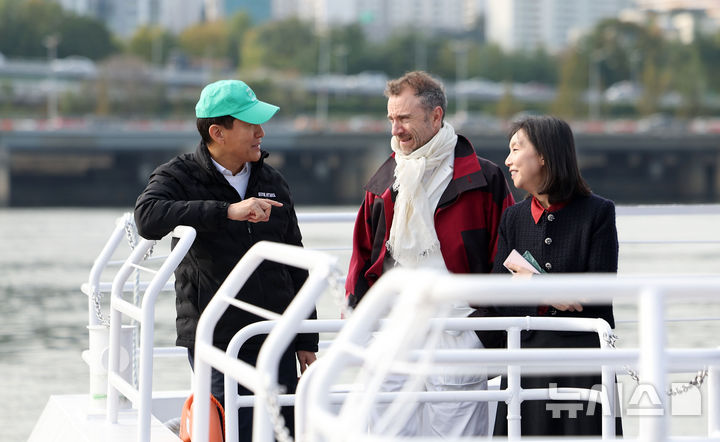 [서울=뉴시스] 김선웅 기자 = 오세훈 서울시장과 건축가 토마스 헤더윅, 최호정 서울시의회 의장이 21일 노들 글로벌 예술섬 착공식 참석하기 위해 서울 용산구 노들섬으로 향하는 한강버스에 탑승해 이야기를 나누고 있다. 2025.10.21. [email protected]