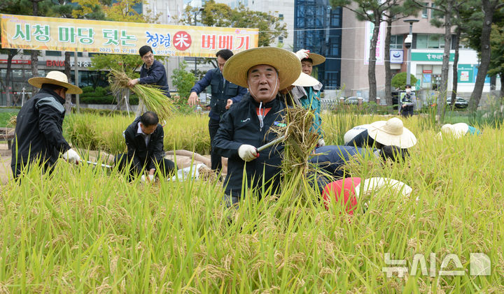 [울산=뉴시스] 배병수 기자 = 김두겸 울산시장이 21일 오후 시청 생활정원 내 조성한 텃논에서 청렴미 벼베기 행사를 하고 있다. 벼는 지난 5월 김두겸 시장과 공무원, 농업단체가 함께 모내기한 지 5개월 만에 수확하는 것이다[email protected].