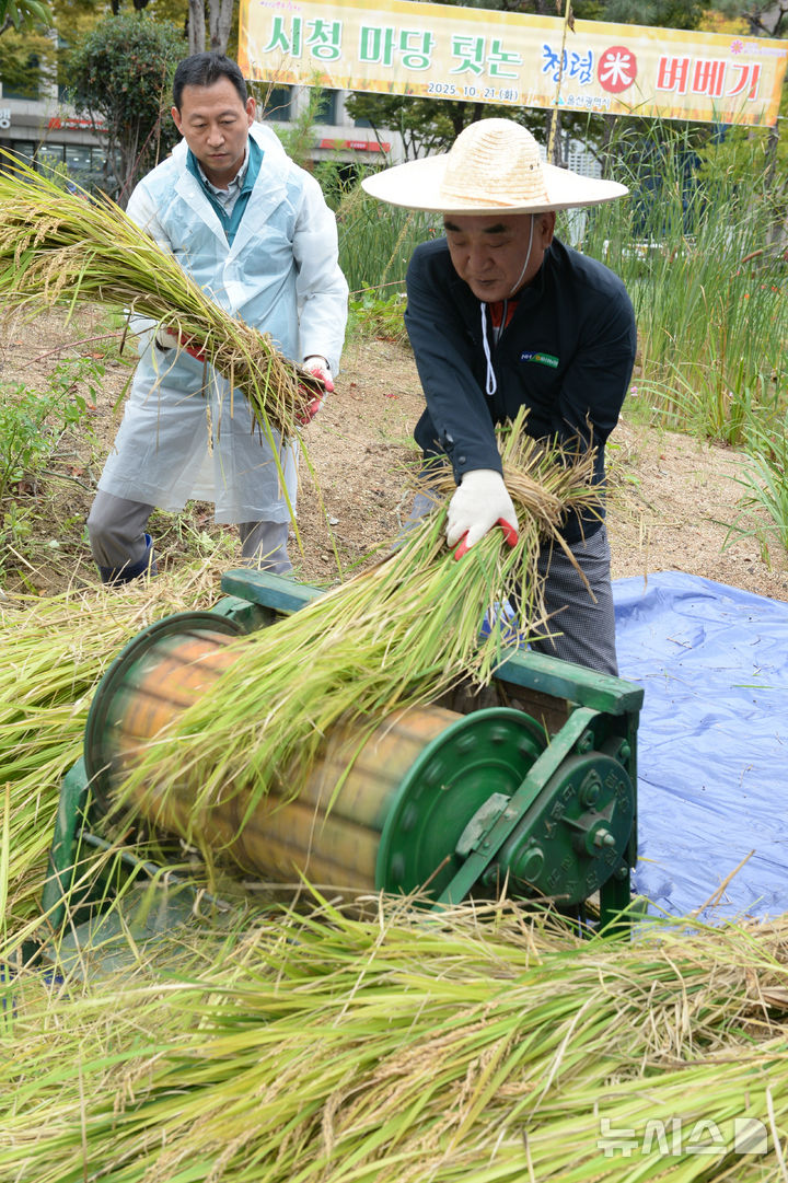 [울산=뉴시스] 배병수 기자 = 김두겸 울산시장이 21일 오후 시청 생활정원 내 조성한 텃논에서 수확한 벼를 탈곡하고 있다. 벼는 지난 5월 김두겸 시장과 공무원, 농업단체가 함께 모내기한 지 5개월 만에 수확하는 것이다[email protected].