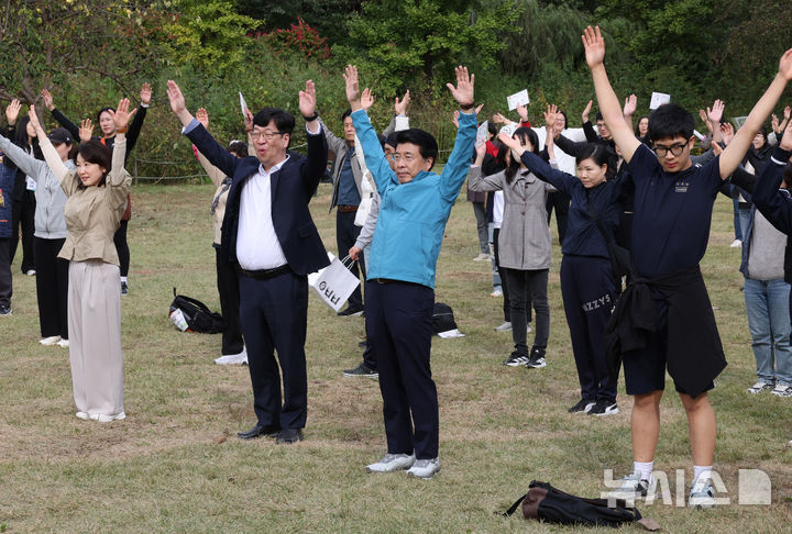 [서울=뉴시스] 배훈식 기자 = 서강석 송파구청장이 21일 오후 서울 송파구 올림픽공원에서 열린 정신건강의 날 기념 걷기 행사에서 참가자들과 함께 준비운동을 하고 있다. 2025.10.21. [email protected]