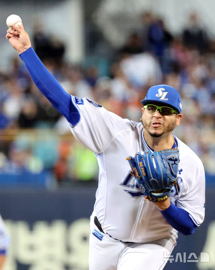 [대구=뉴시스] 이무열 기자 = 21일 대구 수성구 삼성라이온즈파크에서 열린 2025 신한 SOL 뱅크 KBO 포스트시즌 플레이오프 3차전 한화 이글스와 삼성 라이온즈의 경기, 1회초 삼성 선발투수 후라도가 공을 던지고 있다. 2025.10.21. [email protected]
