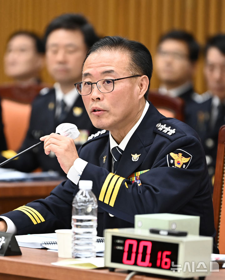 [수원=뉴시스] 김종택 기자 = 황창선 경기남부경찰청장이 21일 경기 수원시 경기남부경찰청에서 열린 국회 행정안전위원회 경기남·북부 경찰청에 대한 국정감사에서 의원 질의에 답변하고 있다. 2025.10.21. [email protected]