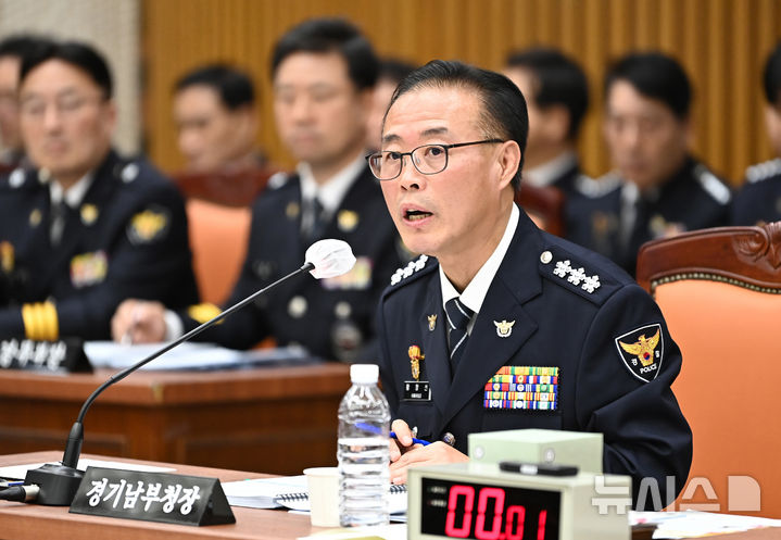 [수원=뉴시스] 김종택 기자 = 황창선 경기남부경찰청장이 21일 경기 수원시 경기남부경찰청에서 열린 국회 행정안전위원회 경기남·북부 경찰청에 대한 국정감사에서 의원 질의에 답변하고 있다. 2025.10.21. [email protected]
