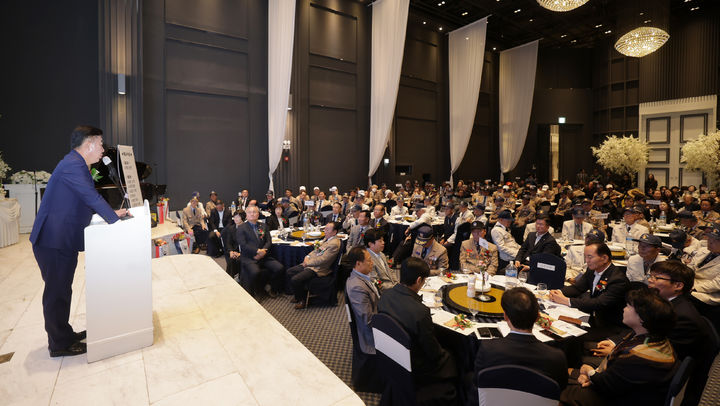 [청주=뉴시스] 22일 충북 청주시 S컨벤션에서 열린 '제11회 보훈가족 한마음 화합행사'에서 이범석 시장이 인사말을 하고 있다. (사진=청주시 제공) 2025.10.22. [email protected]