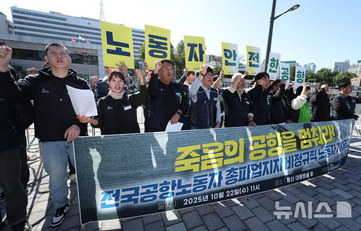 이들은 전국공항노동자 총파업지지하며 정부가 약속했던 정규직 전환과 안전한 노동환경 보장을 이행할 것을 요구했다. 또, 공항노동자들의 야간노동 구조 개선과 4조2교대 전환, 자회사 낙찰률 적용 폐지, 미전환 사업장 정규직 전환 등을 촉구했다. 2025.10.22. [email protected]