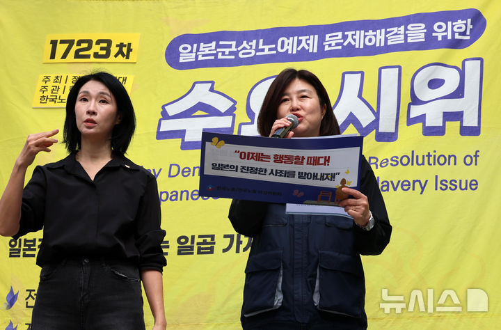 [서울=뉴시스] 이영환 기자 = 정연실 한국노총 상임부위원장 겸 여성위원회 위원장이 22일 오후 서울 종로구 옛 일본대사관 앞에서 열린 1723차 일본군성노예제 문제해결을 위한 수요시위에서 발언을 하고 있다. 2025.10.22. [email protected]