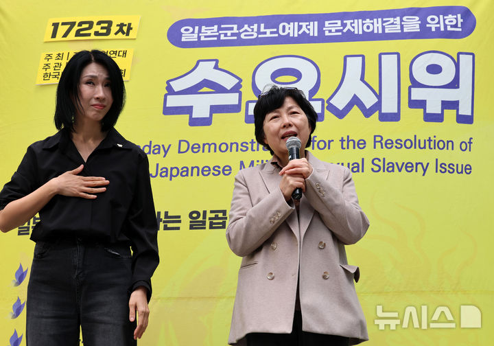[서울=뉴시스] 이영환 기자 = 한경희 정의기억연대 사무총장이 22일 오후 서울 종로구 옛 일본대사관 앞에서 열린 1723차 일본군성노예제 문제해결을 위한 수요시위에서 주간보고를 하고 있다. 2025.10.22. [email protected]