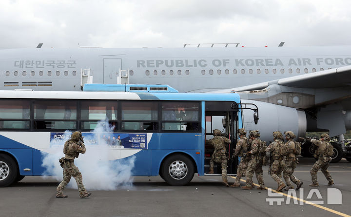 항공기 인질 및 폭발물 테러 상황을 가정한 이날 훈련에는 공군(대테러 초동조치반, 항공특수통제사), 육군 53사단, 부산경찰청 경찰특공대, 김해공항 EOD 등의 유관기간에서 80여 명이 참가했다. 2025.10.22. [email protected]