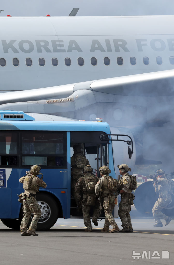 [부산=뉴시스] 하경민 기자 = 2025 APEC 정상회의 대비 대테러 종합훈련이 열린 22일 부산 강서구 제5공중기동비행단 주기장에서 항공특수통제사(CCT)들이 항공기 인질 테러범을 진압하고 있다.