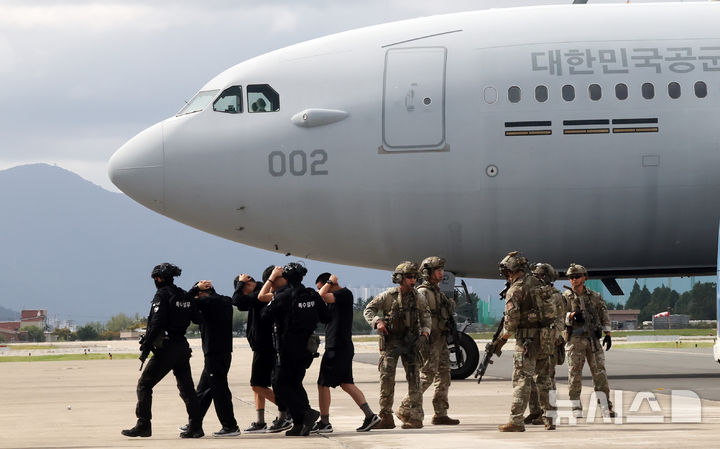 [부산=뉴시스] 하경민 기자 = 2025 APEC 정상회의 대비 대테러 종합훈련이 열린 22일 부산 강서구 제5공중기동비행단 주기장에서 항공특수통제사(CCT) 등이 항공기 인질 테러범을 진압한 뒤 압송하고 있다.