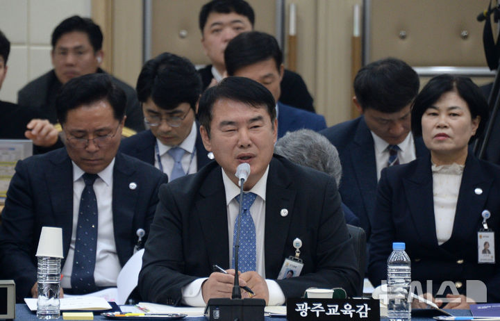 [전주=뉴시스] 김얼 기자 = 이정선(가운데) 광주광역시 교육청 교육감이 22일 전북 전주시 전북대학교에서 열린 '2025년도 교육위원회 국정감사'에 참석해 질의에 답변하고 있다. 2025.10.22. [email protected]