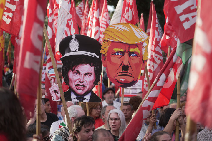[부에노스아이레스=AP/뉴시스] 22일(현지 시간) 아르헨티나 부에노스아이레스 미국 대사관 밖에서 반정부 시위대가 도널드 트럼프 미국 대통령과 하비에르 밀레이 대통령을 풍자하는 팻말을 들고 시위하고 있다. 2025.10.23.