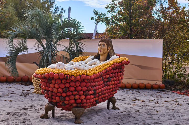 [벨리츠=AP/뉴시스] 21일(현지 시간) 독일 베를린 인근 벨리츠 마을의 클라이스토프 농장에서 열린 연례 호박 축제에 클레오파트라를 형상화한 작품이 전시돼 있다. 올해 축제 주제는 ‘강한 여성들’이다. 2025.10.23.