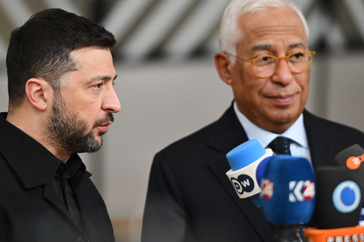 [브뤼셀=AP/뉴시스] 볼로디미르 젤렌스키(왼쪽) 우크라이나 대통령과 안토니우 코스타 유럽이사회(EC) 의장이 23일(현지 시간) 벨기에 브뤼셀 EC 본부에서 열리는 유럽연합(EU) 정상회의에 도착해 취재진 질문에 답하고 있다. 2025.10.23.
