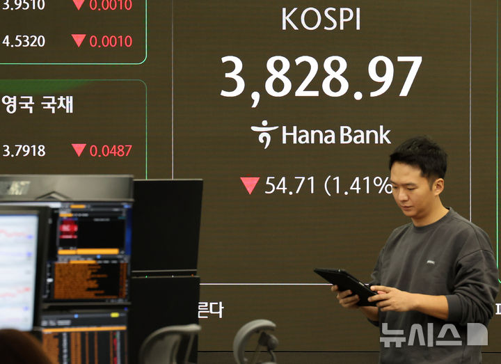 [서울=뉴시스] 배훈식 기자 = 23일 오전 서울 중구 하나은행 딜링룸 전광판에 코스피가 전 거래일보다 54.71 포인트(1.41%) 내린 3828.97 포인트를 나타내며 하락 출발하고 있다. 2025.10.23. [email protected]