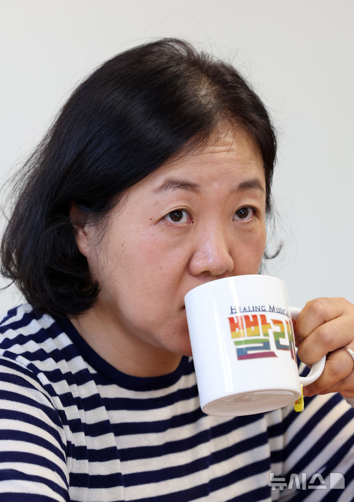 [서울=뉴시스] 배훈식 기자 = 뮤지컬 '빨래' 추민주 연출가가 23일 오후 서울 종로구 씨에이치수박 사무실에서 뉴시스와 인터뷰하며 음료를 마시고 있다. 2025.10.23. [email protected]