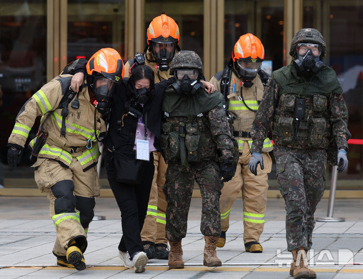 [서울=뉴시스] 김진아 기자 = 23일 서울 동대문구 청량리역 일대에서 진행된 열차 방화·백화점 방화 등 복합 대형 화재 사고 대비 '2025 동대문구 안전한국훈련 긴급구조 종합훈련'에서 소방대원과 군장병들이 인명구조 훈련을 하고 있다. 2025.10.23. [email protected]