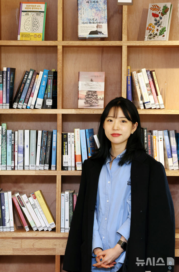 [서울=뉴시스] 배훈식 기자 = 연작소설집 '아무도 오지 않는 곳에서' 천선란 작가가 23일 오후 서울 중구 남산책방에서 뉴시스와 인터뷰 전 포즈를 취하고 있다. 2025.10.23. [email protected]