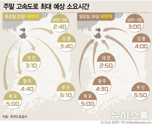 [서울=뉴시스] 24일 한국도로공사는 10월 네 번째 주말 선선한 가을 날씨로 고속도로 교통량이 평소보다 많을 것으로 예상했다. 특히 이번 주부터 강원권 단풍이 절정을 맞이하여, 영동 방향 교통량과 정체가 집중될 것으로 전망했다. (그래픽=전진우 기자)