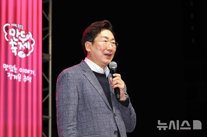 [원주=뉴시스] 이덕화 기자 = 24일 강원 원주시 대표 먹거리축제인 '원주만두축제'가 중앙동 전통시장과 문화의거리, 원일로 일원에서 열린 가운데 원강수 원주시장이 축제의 개막을 선언하고 있다. 2025.10.24. [email protected]