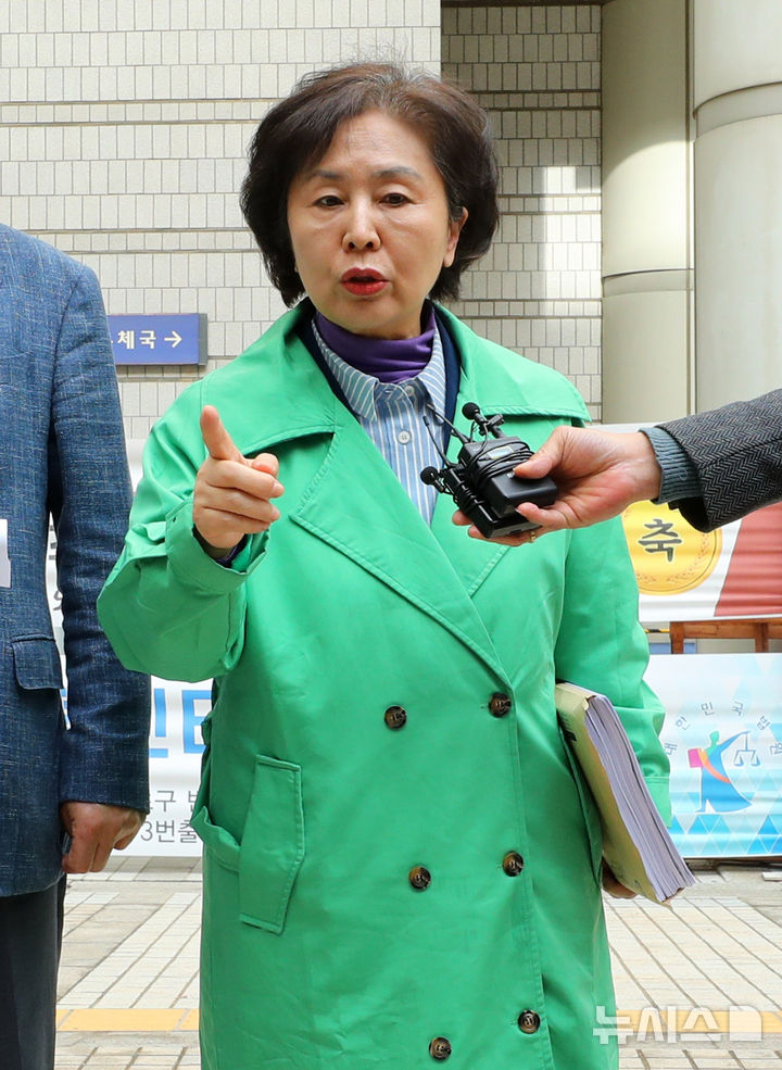 [서울=뉴시스] 김혜진 기자 = 명태균 공천개입 의혹에 연루된 김영선 전 국민의 힘 의원이 24일 오전 서울 서초구 서울중앙지방법원에서 열리는 김건희 여사의 자본시장법 위반 등 혐의 재판에 증인으로 출석하기 전 기자회견을 열고 발언하고 있다. 2025.10.24 [email protected]