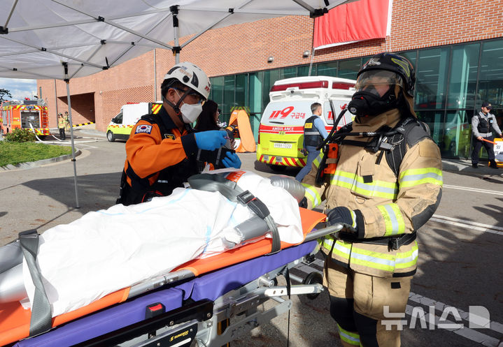 [인천=뉴시스] 전진환 기자 = 24일 인천 계양구 한 공장에서 공장 복합 재난 발생을 대비해 실시된 2025년 긴급구조종합훈련에서 구급대원들이 공장 화재로 인한 부상자를 분류하고 있다. 2025.10.24. [email protected]