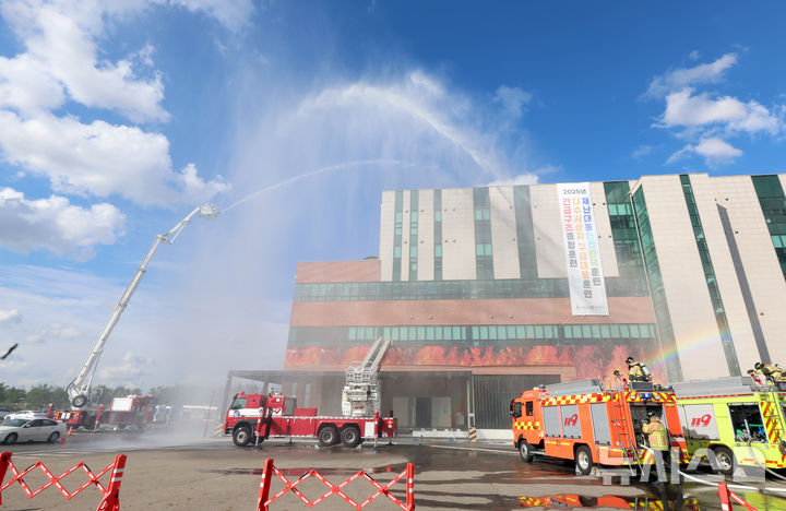 [인천=뉴시스] 전진환 기자 = 24일 인천 계양구 한 공장에서 공장 복합 재난 발생을 대비해 실시된 2025년 긴급구조종합훈련에서 소방관들이 화재 진화를 위해 방수하고 있다. 2025.10.24. [email protected]