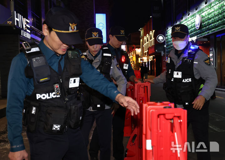 [서울=뉴시스] 배훈식 기자 = 핼러윈 데이를 일주일 앞둔 24일 오후 서울 용산구 이태원세계음식거리에서 경찰이 인파 관리를 위한 중앙분리대를 점검하고 있다. 2025.10.24. [email protected]
