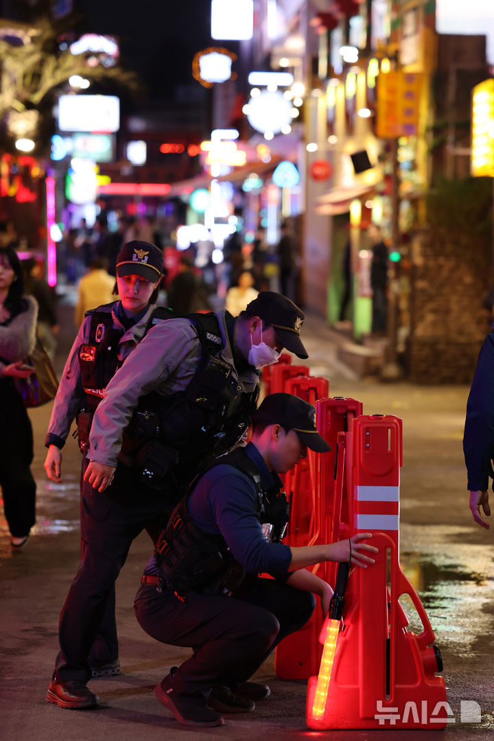 [서울=뉴시스] 배훈식 기자 = 핼러윈 데이를 일주일 앞둔 24일 오후 서울 용산구 이태원세계음식거리에서 경찰이 인파 관리를 위한 중앙분리대를 점검하고 있다. 2025.10.24. [email protected]