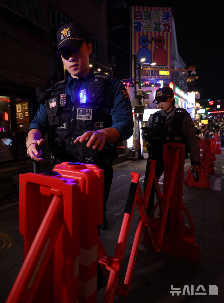 [서울=뉴시스] 배훈식 기자 = 핼러윈 데이를 일주일 앞둔 24일 오후 서울 용산구 이태원세계음식거리에서 경찰이 인파 관리를 위한 중앙분리대를 점검하고 있다. 2025.10.24. [email protected]