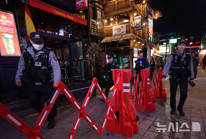 [서울=뉴시스] 배훈식 기자 = 핼러윈 데이를 일주일 앞둔 24일 오후 서울 용산구 이태원세계음식거리에서 경찰이 인파 관리를 위한 중앙분리대를 점검하고 있다. 2025.10.24. [email protected]