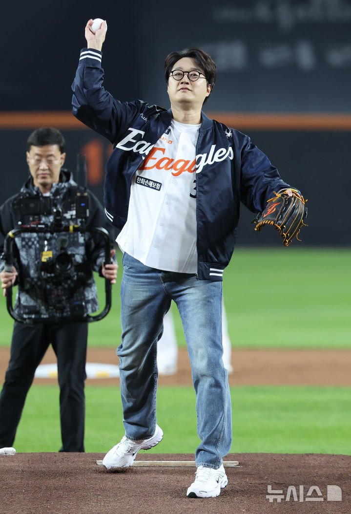 [대전=뉴시스] 황준선 기자 = 24일 대전 중구 한화생명볼파크에서 열린 2025 KBO 포스트시즌 플레이오프 5차전 삼성 라이온즈와 한화 이글스의 경기, 가수 이장원이 시구를 하고 있다. 2025.10.24. [email protected]