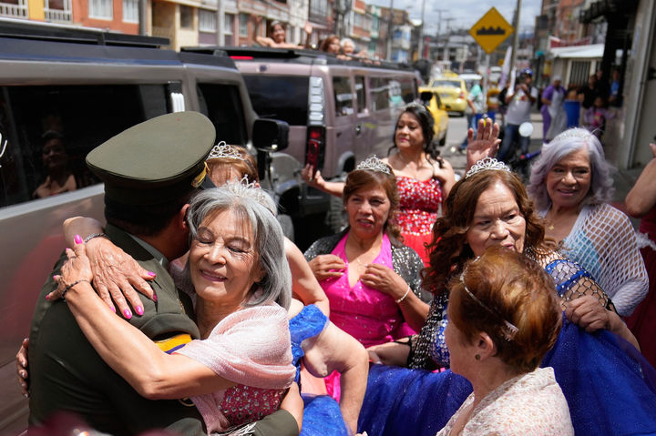 [보고타=AP/뉴시스] 카르멘 모라(71)가 24일(현지 시간) 콜롬비아 보고타에서 15세 생일에 치르는 성인식 '킨세아녜라'를 경험하지 못한 여성들을 위한 행사에 참석하기에 앞서, 본인을 행사장까지 에스코트할 경찰관을 포옹하고 있다. 이 행사는 비영리재단 '수에뇨스 에초스'(꿈을 현실로) 주최로 열렸다. 2025.10.25.