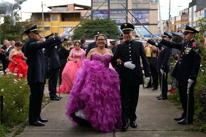 [보고타=AP/뉴시스] 24일(현지 시간) 콜롬비아 보고타에서 15세 생일에 치르는 성인식 '킨세아녜라'를 경험하지 못한 여성들을 위한 행사가 열려 경찰관들이 이제는 노년에 접어든 여성들을 행사장으로 안내하고 있다. 이 행사는 비영리재단 '수에뇨스 에초스'(꿈을 현실로) 주최로 열렸다. 2025.10.25.