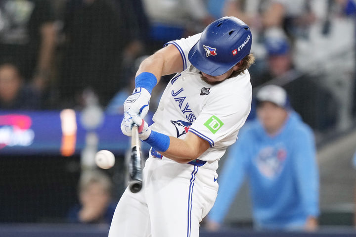 [토론토=AP/뉴시스] 토론토 블루제이스의 애디슨 바거가 24일(현지 시간) 캐나다 토론토 로저스 센터에서 열린 2025 메이저리그 월드시리즈(WS·7전4선승제) 1차전 LA 다저스와 경기 6회 말 만루 홈런을 치고 있다. 2025.10.25.