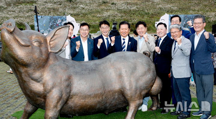 [제주=뉴시스] 우장호 기자 = 정청래 더불어민주당 대표가 25일 오후 제주시 애월읍 봉성리 새별오름에서 열린 '2025 제주도새기축제'를 찾아 제주 돼지 조형물 앞에서 기념촬영하고 있다. 2025.10.25. [email protected]