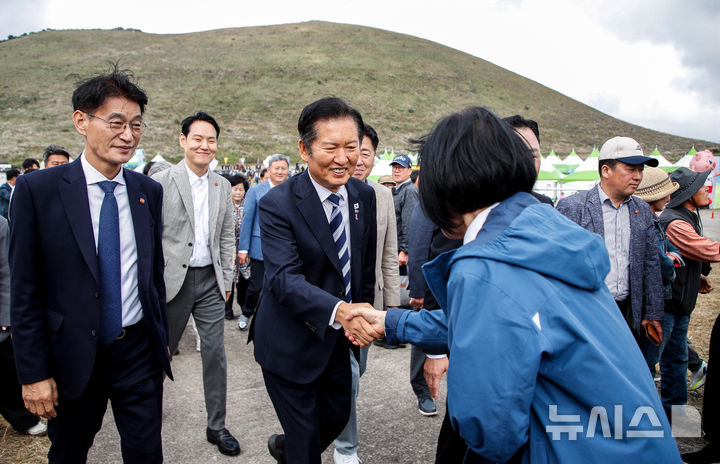 [제주=뉴시스] 우장호 기자 = 정청래 더불어민주당 대표가 25일 오후 제주시 애월읍 봉성리 새별오름에서 열린 '2025 제주도새기축제'를 찾아 도민과 관광객들과 인사를 나누고 있다. 2025.10.25. [email protected]
