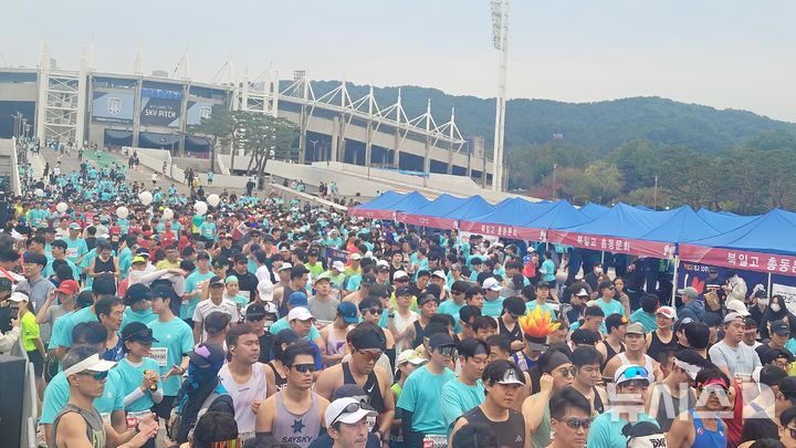 [천안=뉴시스] 최영민 기자=26일, 천안종합운동장에서 열린 제4회 천안이봉주마라톤대회의 참가자들이 출발구역에서 레이스 시작을 대기하고 있다. 2025.10.26 [email protected]