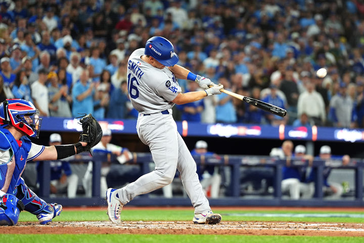 [토론토=AP/뉴시스] 로스앤젤레스(LA) 다저스의 윌 스미스가 25일(현지 시간) 캐나다 토론토 로저스 센터에서 열린 2025 메이저리그 월드시리즈(WS·7전4선승제) 2차전 토론토 블루제이스와 경기 7회 초 1점 홈런을 치고 있다. 다저스가 5-1로 이기고 1승1패를 기록했다. 2025.10.26.