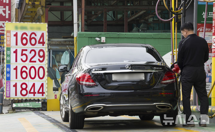 [서울=뉴시스] 김근수 기자 = 26일 서울 시내의 한 주유소에서 시민들이 주유를 하고 있다.