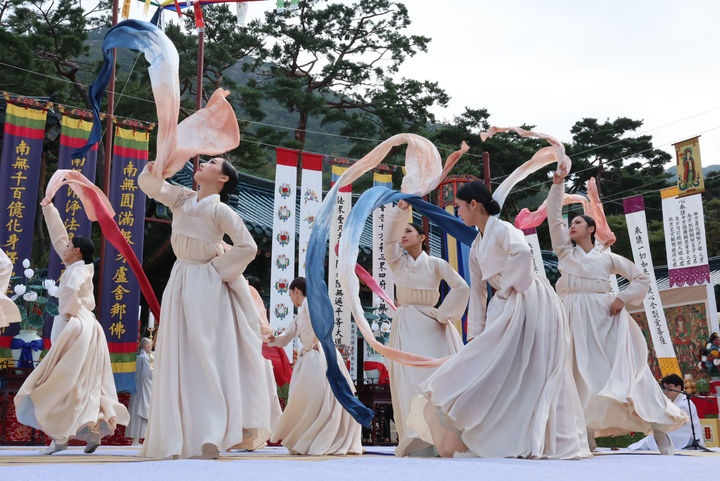 [서울=뉴시스] 전진환 기자 = 광복 80주년을 맞아 25일 서울 은평구 대한불교조계종 진관사는 수륙재 개건 627주년 기념 ‘2025년 진관사 수륙재’ 회향식을 봉행한 가운데 대웅전 앞 야단법석에서 비천무 무용단이 춤을 선보이고 있다. (사진=진관사 제공) 2025.10.26. [email protected]