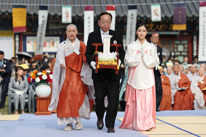 [서울=뉴시스] 전진환 기자 = 광복 80주년을 맞아 대한불교조계종 진관사가 25일 수륙재 개건 627주년 기념 ‘2025년 진관사 수륙재’ 회향식을 봉행한 가운데 비구니 김진 광복회 부회장이 독립유공자 33인의 위패를 봉안하고 있다.  (사진=진관사 제공) 2025.10.26. [email protected]