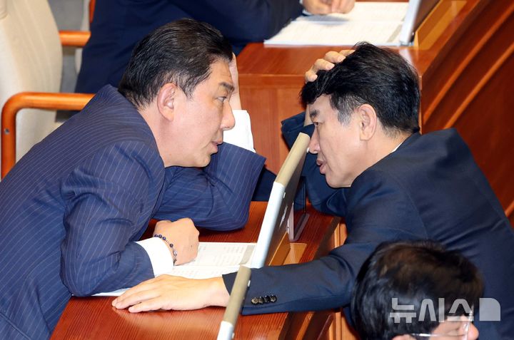 [서울=뉴시스] 조성봉 기자 = 김병기 더불어민주당 원내대표와 문진석 원내운영수석보대표가 26일 오후 서울 여의도 국회 본회의장에서 열린 제429회 국회(정기회) 제10차 본회의에서 대화를 하고 있다. 2025.10.26. suncho21@newsis.